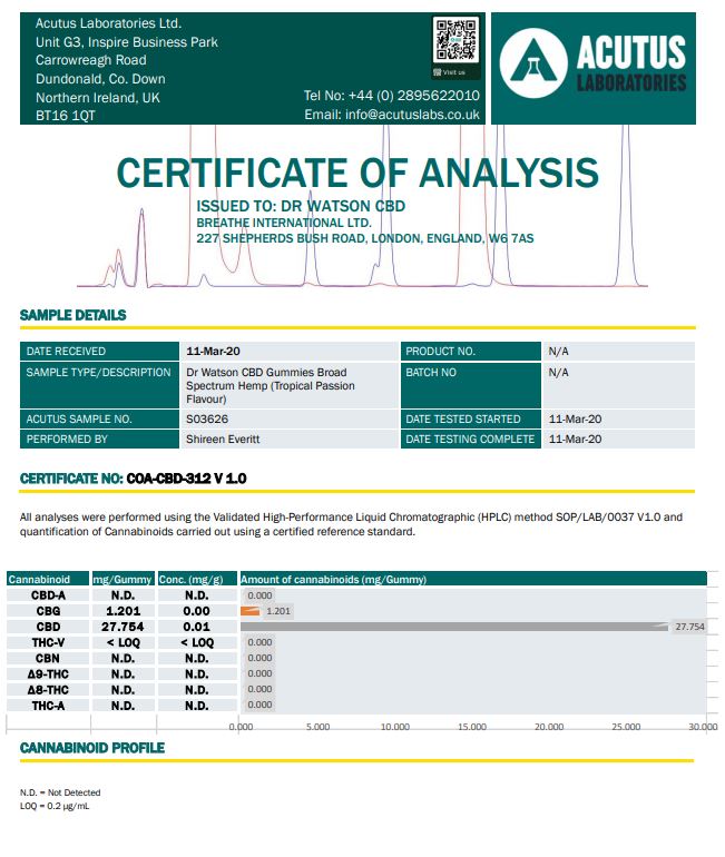 Ingredients: Fructose, sugar, syrup, water, agar, gelatin, hemp extract 25mg per sweet, (21 mg CBD, 24mg CBG), MCT coconut oil, natural passionfruit extract, citric acid, peach & mango natural flavouring
