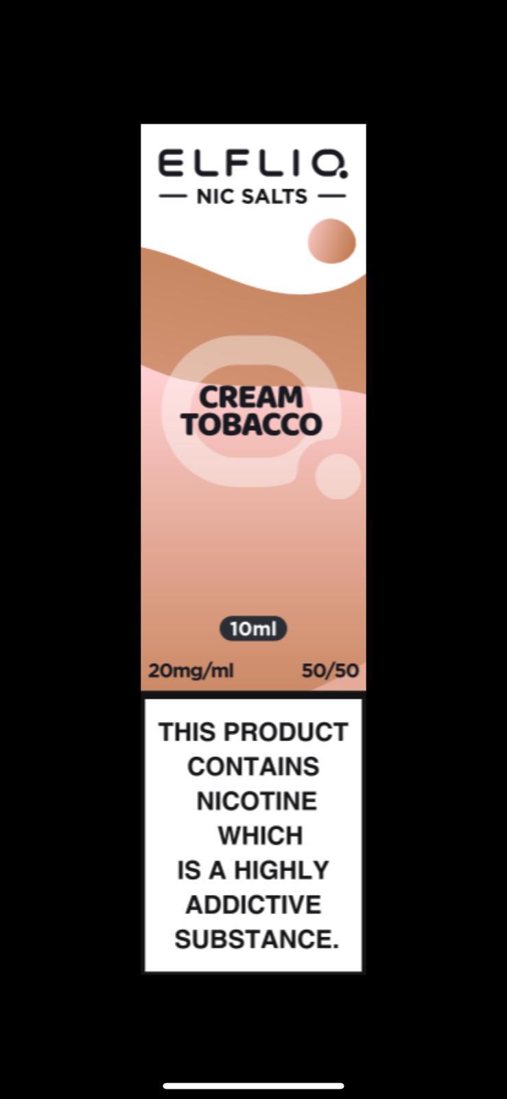 Elf Bar ELFLIQ - Nic Salt - Cream Tobacco - A rich blend of roasted tobacco with a sweet cream nutty taste.