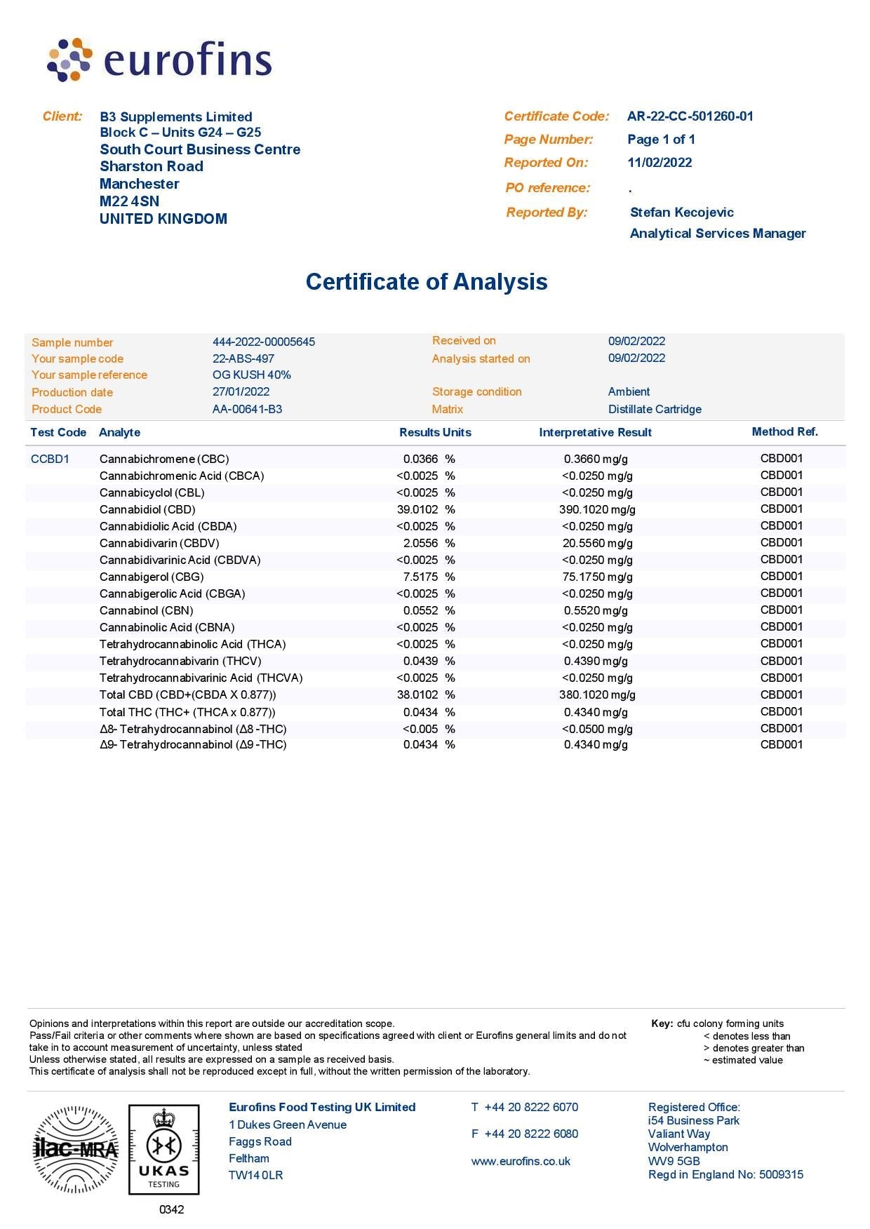 - CBD: 40%, Gelato (euphoric & energising feeling, immune system support, increases focus, better digestive health)