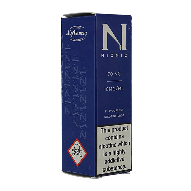 Nic Nic - 70 VG Nic Shot - Add this 18mg 70 VG Nic Nic nicotine shot to your e-liquid for a quality nicotine hit. Crafted using only pharmaceutical Grade Nicotine, Vegetable Glycerine and Propylene Glycol.