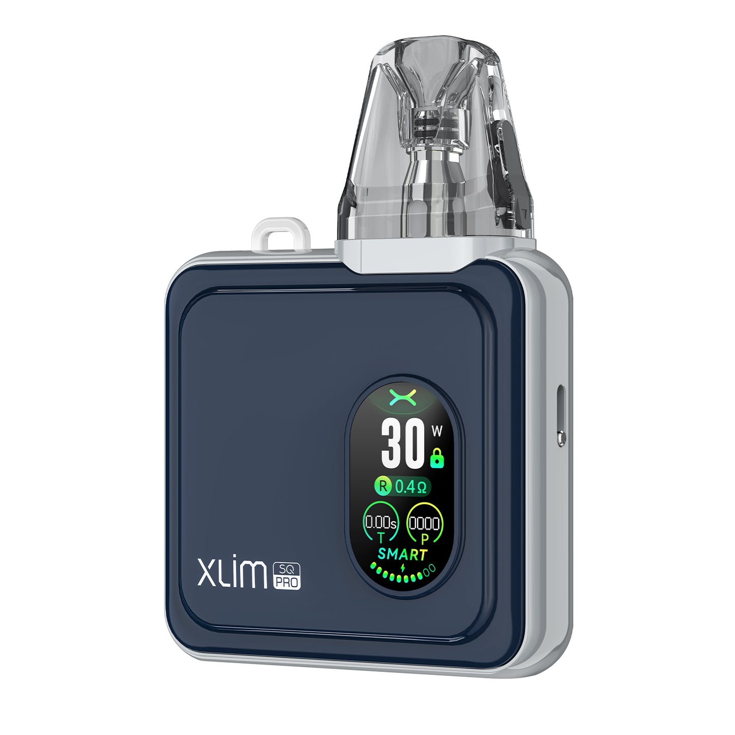 The OXVA XLIM SQ Pro pod vape kit is a compact, mouth-to-lung vaping system featuring a 1200mAh battery, a 0.96-inch color TFT display, and a range of pod options for versatility. Key features include a 30W maximum output, adjustable side airflow control, Type-C fast charging, and a convenient lanyard. Available in eight finishes, it allows for customization through smart and power modes, and the large TFT display offers dynamic themes. The kit supports various Xlim pods, catering to both freebase and nic salt e-liquids, with multiple resistance levels for RDL and MTL vaping. The package includes the device, two Xlim V3 pods, a Type-C USB charging cable, a lanyard, and a user manual.