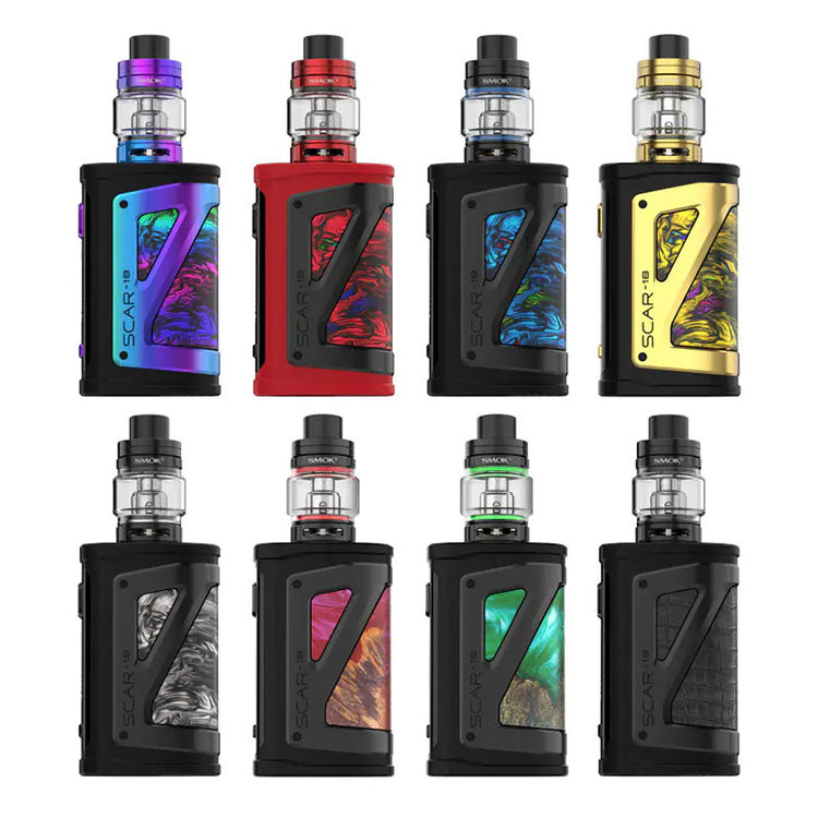 Smok Scar 18 Kit - Lighting up new possibilities of box mod, SCAR-18 becomes synonymous with power and performance. It is driven by the latest chipset IQ-X with stable output and outstanding efficiency, and uses dual 18650 battery to provide a maximum power of 230W. The newly developed TFV9 tank comes with two V9 Meshed 0.15Ω coils that are designed for sub-ohm vaping for cloud chasers. Innovation keeps changing the vaping experience!