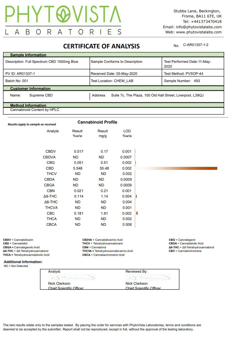 The THC concentration in Supreme CBD's own full-spectrum CBD products is 0.14%, which is legal with regards to the regulatory standard. This means that it is 100% legal and safe for use in the EU and the United Kingdom. Also, because there are only trace amounts of THC inside the oil, it will have no psychoactive effects on the body, so you can experience all the positive effects of the cannabinoids and the hemp plant without the dizzying ‘high’. This also means you can use our Supreme CBD oils and go about your day as normal.